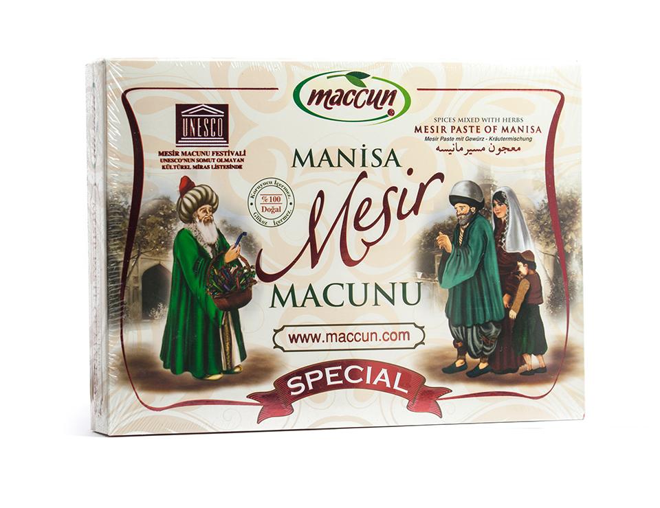 İçeriğinde yalnızca bitki ve baharatlar , şeker bulunur. Tarçından zencefile , karanfilden havlıcan'a onlarca baharatın özel yöntemlerle şeker şurubuyla macunlanmasıyla yapılır. Baharatlar doğal halde alınıp kendi değirmenlerimizde öğütülerek hazırlanır. Şeker dışında bir tatlandırıcı kullanılmaz.Yapılış yöntemi sebebiyle uygun ortamda 3 (üç) yıla kadar saklanıp tüketilebilir.Paket içerisinde 20 adet küçük mesir macunu bulunur.