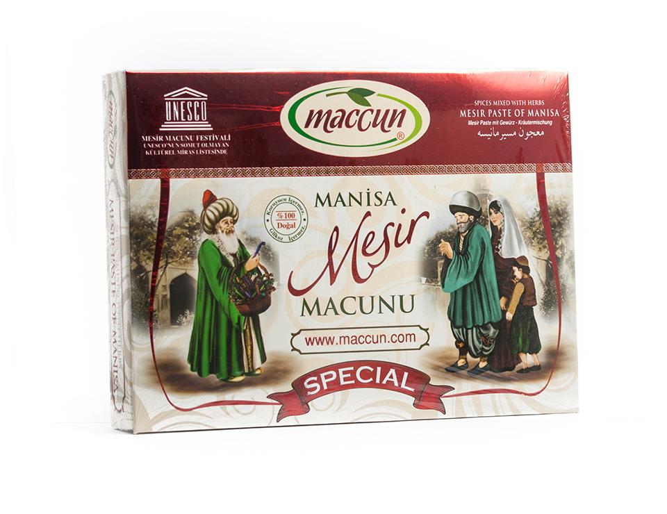 İçeriğinde yalnızca bitki ve baharatlar , şeker bulunur. Tarçından zencefile, karanfilden havlıcan'a onlarca baharatın özel yöntemlerle şeker şurubuyla macunlanmasıyla yapılır. Baharatlar doğal halde alınıp kendi değirmenlerimizde öğütülerek hazırlanır. Şeker dışında bir tatlandırıcı kullanılmaz.Yapılış yöntemi sebebiyle uygun ortamda 3 (üç) yıla kadar saklanıp tüketilebilir.Paket içerisinde 30 adet küçük mesir macunu bulunur.